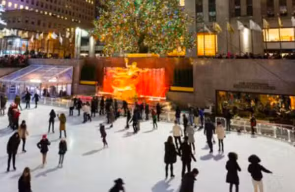 Sin duda la más famosa de Manhattan, la pista de patinaje del Rockefeller Center está coronada por las magníficas decoraciones del Rockefeller Plaza y por el famosísimo Rockefeller Christmas Tree, el enorme árbol de Navidad de Nueva York.