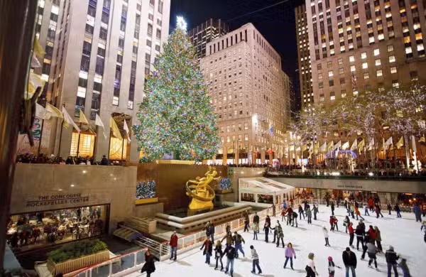 Certainement la plus connue de Manhattan, la patinoire du Rockefeller Center est surplombée par les magnifiques décorations de Rockefeller Plaza et par le célébrissime Rockefeller Christmas Tree, l’immense sapin de Noël de New York.